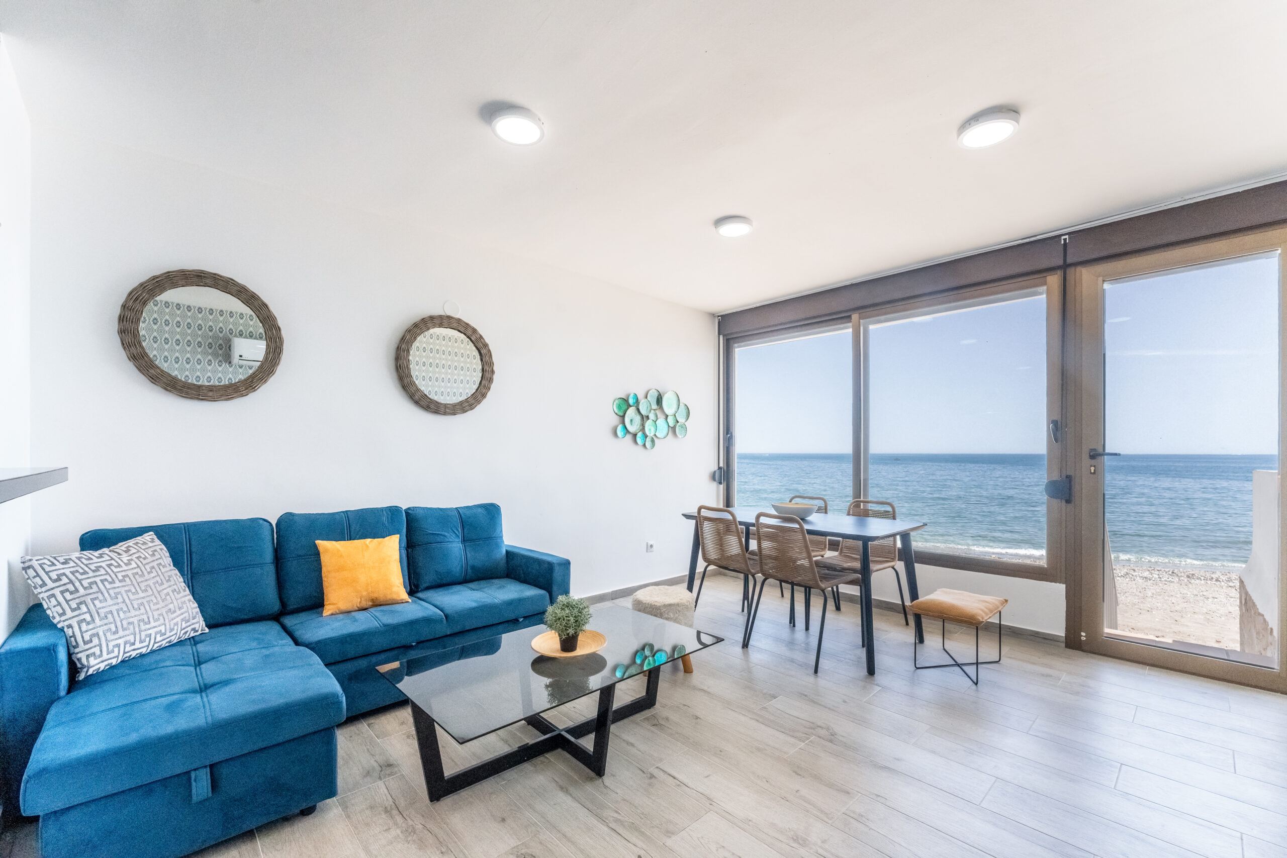 Enjoy your morning coffee or a sunset glass of wine overlooking the Mediterranean, just a few steps from the sand. The apartment features a fully equipped kitchen, a modern bathroom, a comfortable living room with Smart TV, and fast Wi-Fi – everything you need for a relaxing coastal stay.